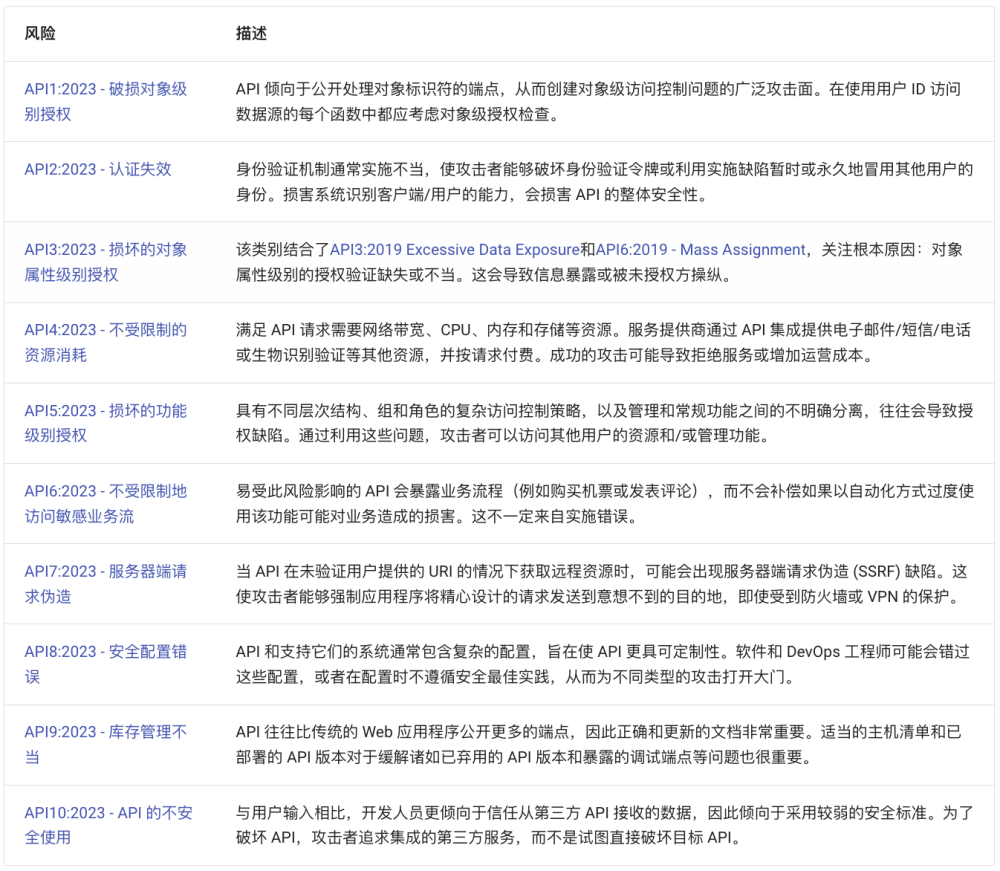 OWASP API Security是一项专注于API安全的研究项目,旨在唤醒公众对API潜在风险的认识,提醒开发人员和安全人员加强对API安全的关注。从2019年首次发布API Security Top 10起,这份清单便以其独特的视角,准确地揭示了API安全中的重要风险。随后,2023年的更新版本是 OWASP API Security Top 10 的第二版,距首次发布正好四年。API(安全)领域发生了很多变化。API 流量快速增长让API 安全获得更多关注,涌现出许多新的 API 安全供应商/解决方案,当然,攻击者已经开发出新的技能和技巧来破坏 API。以下是2023年发布的最新的风险清单: